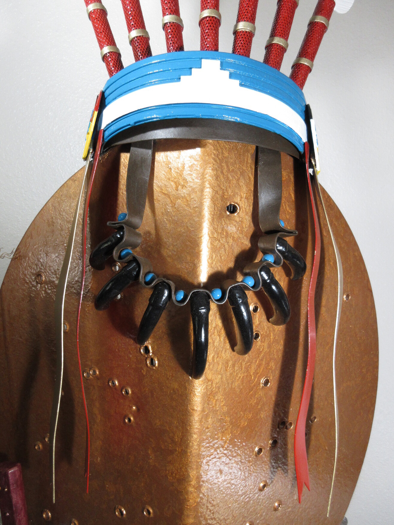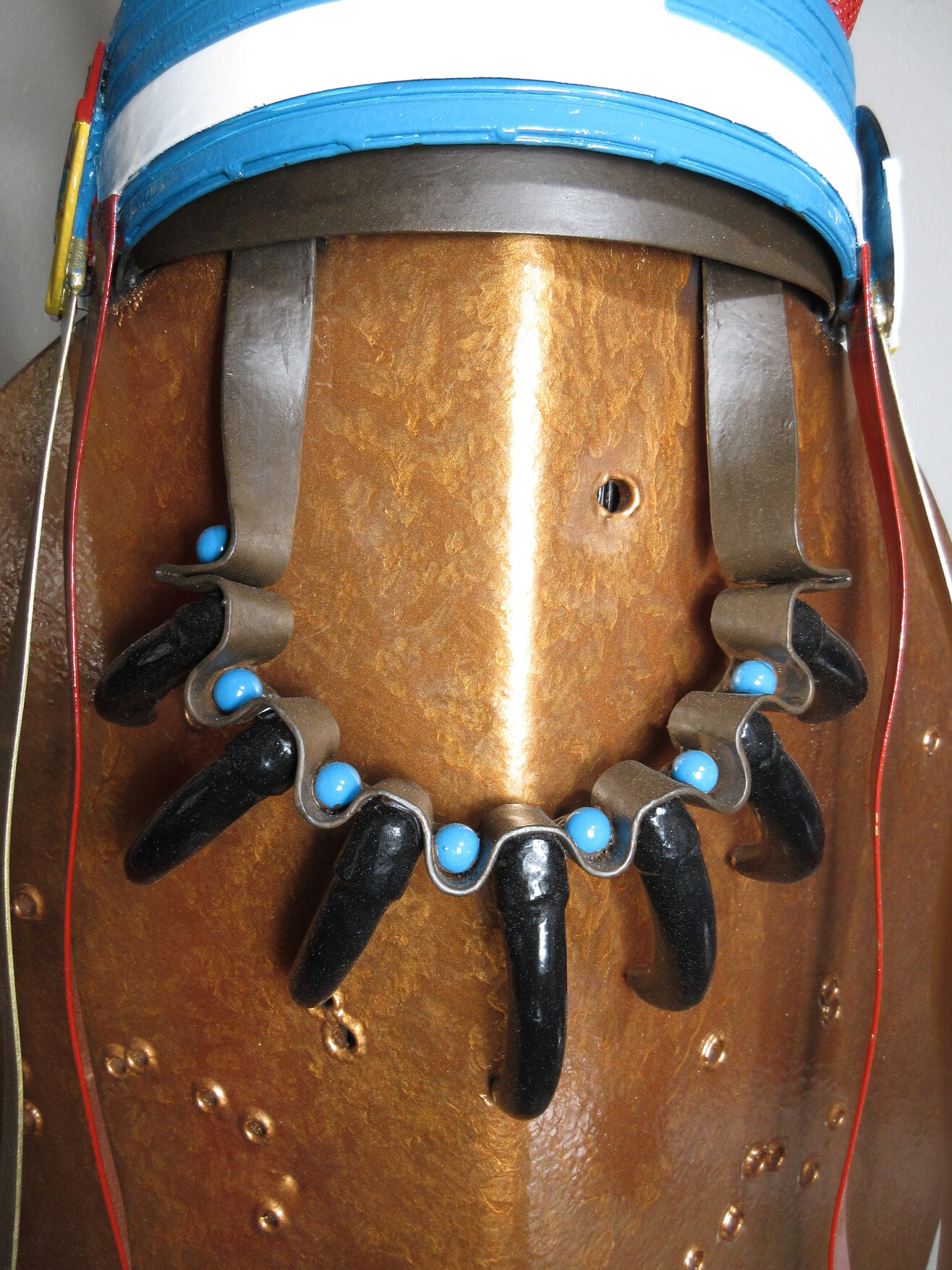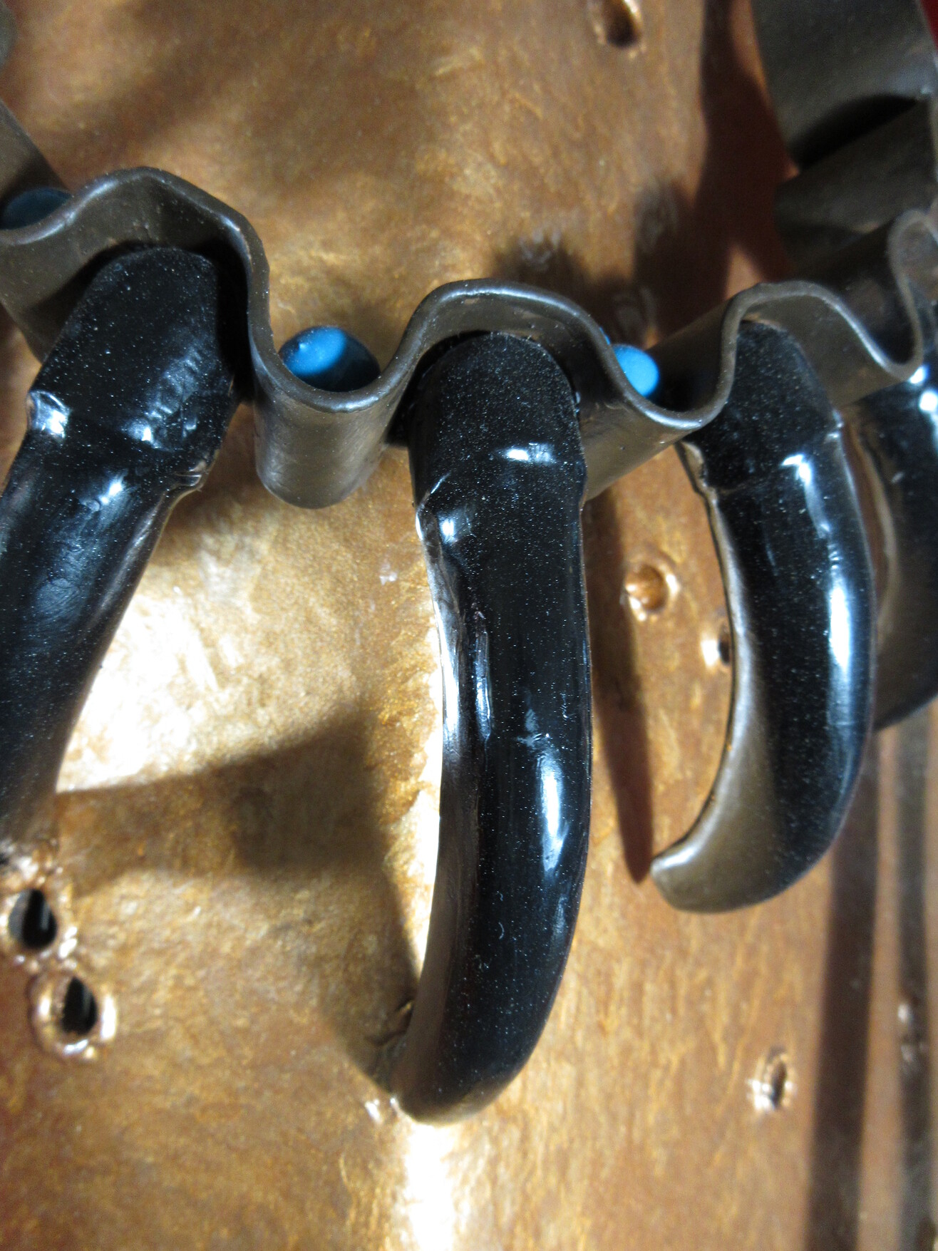 claw necklace is a traditional design is true to form. There are seven bear claws each from a different bear. The bravery of this warrior is great, to hunt seven grizzly with a bow and arrow.