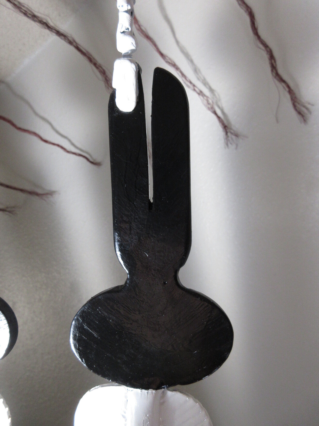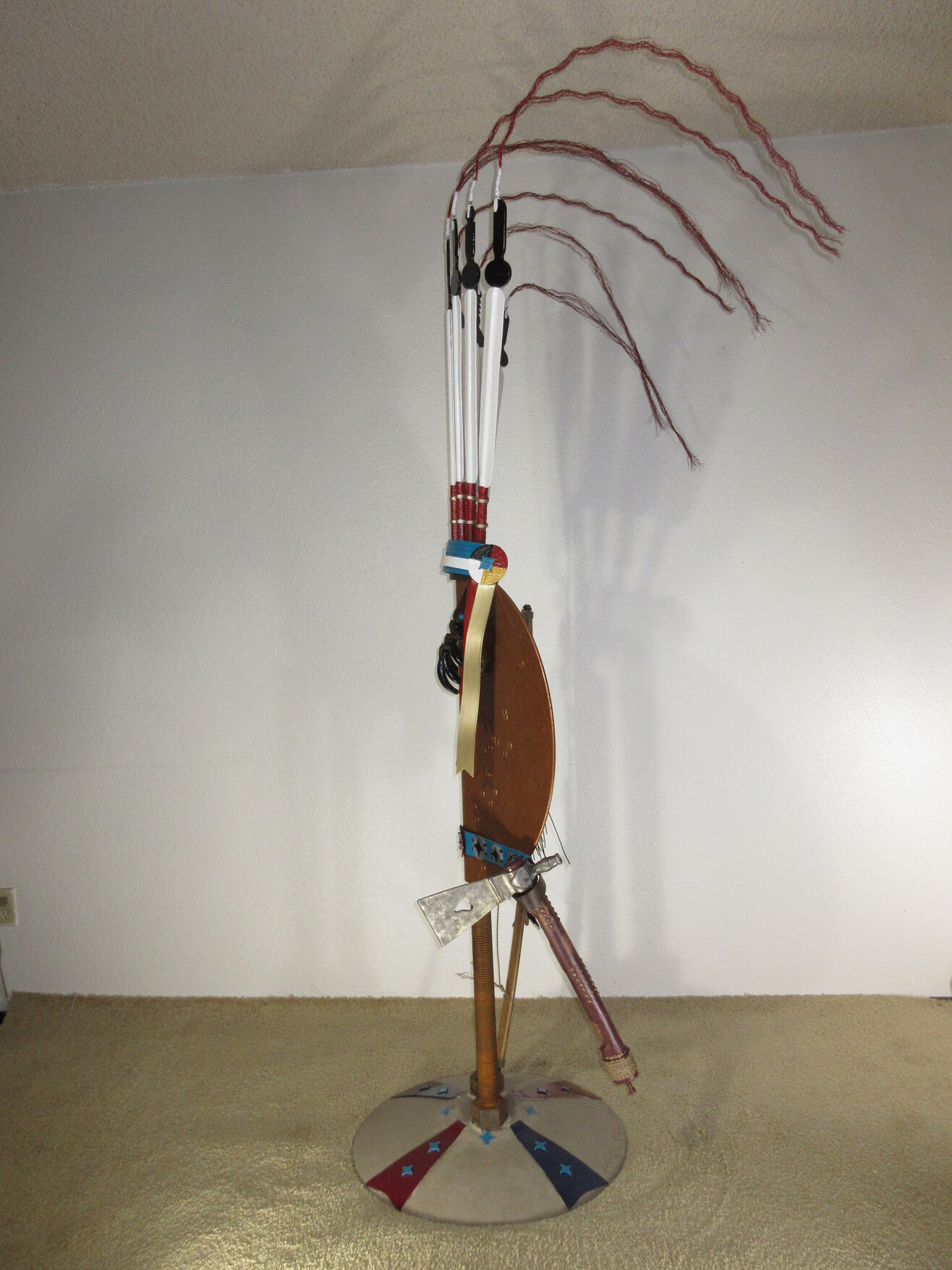 The side rossetts depict the "four directions" of the medicine wheel. The center is representivive of "The Great Spirit". The white is the north, earth, physical - nightime/winter. The red is the south, sun, fire, midday/summer. The black is the west, water, sunset/fall. The yellow is the east, air, sunrise/spring.