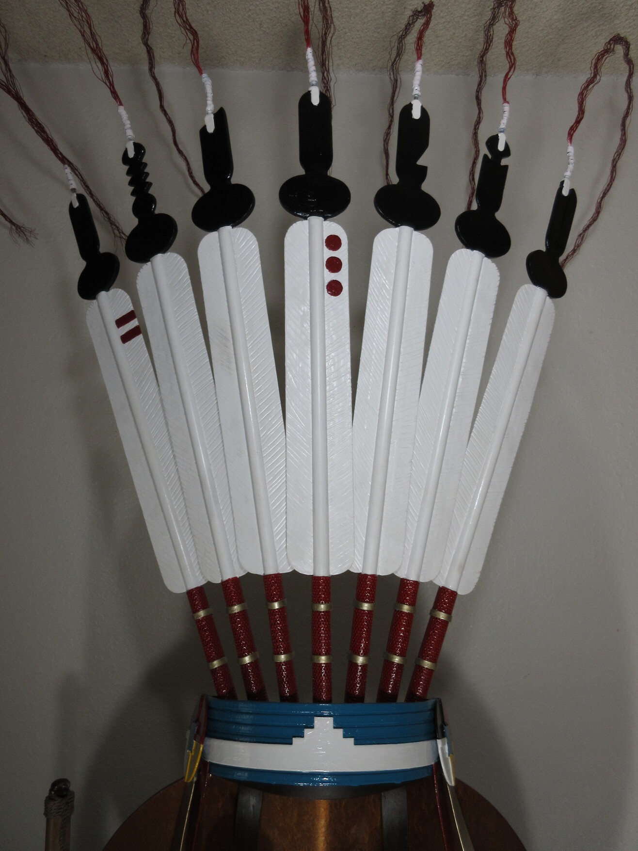 The The top black "feathers" of the war bonnet depict different acts of bravery and honor given to the warrior.